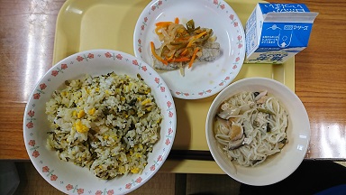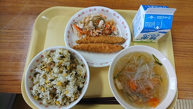 「高菜めし、牛乳、ししゃもフライ、五目あえ、春雨汁」