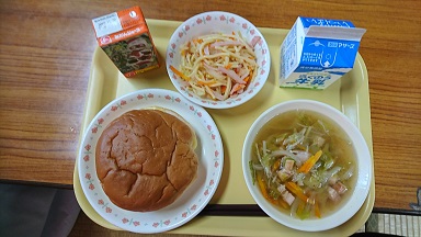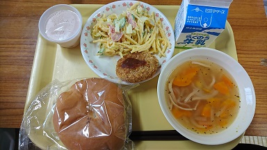 「チーズパン、牛乳、ベーコンレタススープ、ナッツスパゲティサラダ、ジューシー」