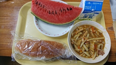 「ミルクパン、牛乳、カレーうどん、すいか」