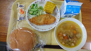 「フィッシュバーガー、牛乳、添え野菜、コンソメスープ、とうもろこし」