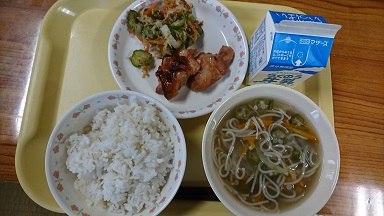 「麦ごはん、牛乳、鶏肉の照り焼き、和風サラダ、七夕そうめん汁」