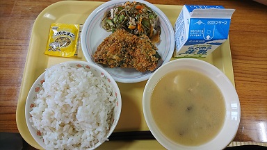 「麦ごはん、ふりかけ、牛乳、魚の青じそフライ、五目あえ、けんちん汁」