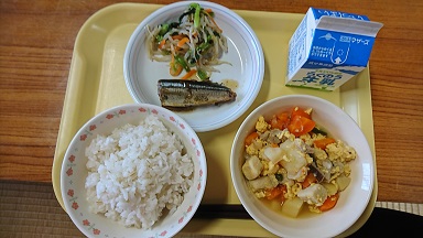 「麦ごはん、牛乳、さんまのレモン煮、寒天サラダ、そらたま汁」
