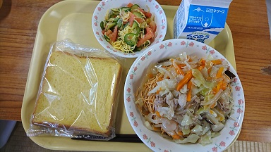 「米粉入りかぼちゃパン、牛乳、パリパリ焼きそば、トマトの中華あえ」