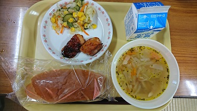 「ミルクパン、牛乳、照り焼きチキン、オニオンスープ、コーンサラダ」