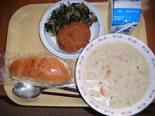 「牛乳、ミルクパン、クリームシチュー、かぼちゃコロッケ、ほうれん草ソテー」
