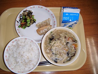 「牛乳、麦ごはん、八宝菜、春雨サラダ、ぽんかん」