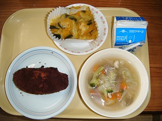 「牛乳、ココア揚げパン、冬野菜スープ、かぼちゃチーズ焼き」