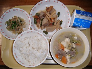 「牛乳、麦ごはん、豚汁、いかと里芋の煮物、だいこんサラダ」