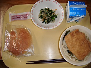 「牛乳、米粉パン、ジャム、きつねうどん、ごまあえ」でした。