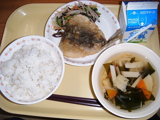 「麦ごはん、牛乳、すりみあげ、ひじきサラダ、わかめスープ」