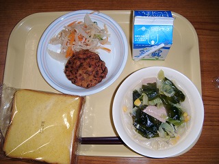 「米粉パン、牛乳、トマトオムレツ、しめじあえ、ワンタンスープ」