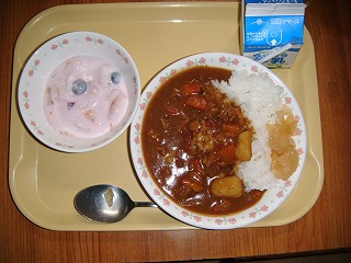 「牛乳、カツカレーライス、福神漬け、イチゴ入りフルーツヨーグルト」