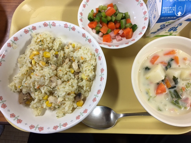 「チキンライス 牛乳 やさいスープ きびなごフライ つけあわせ」でした。
