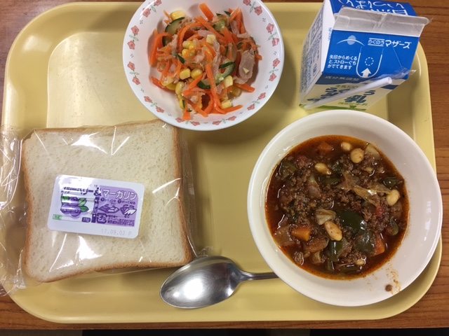 「食パン ジャム&マーガリン チリコンカン にんじんツナサラダ」でした。