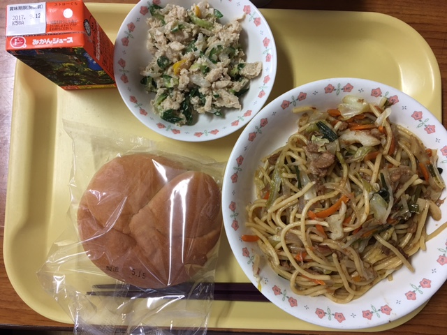 「米粉パン 牛乳 ソース焼きそば バンバンジー みかんジュース」でした。