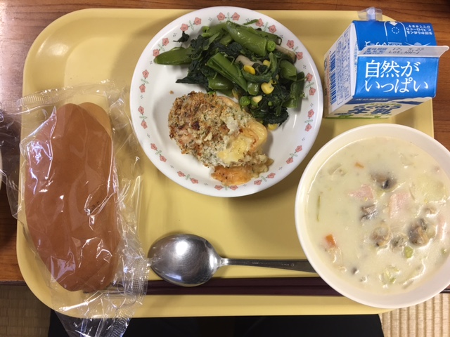 「コッペパン 牛乳 あさりと春キャベツのクリームスープ