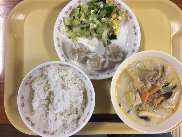 「麦ごはん 牛乳 チキンシューマイ タイピーエン かみかみサラダ」でした。