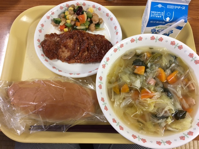「コッペパン 牛乳 やさいスープ バーベキューポーク ビーンズサラダ」でした。