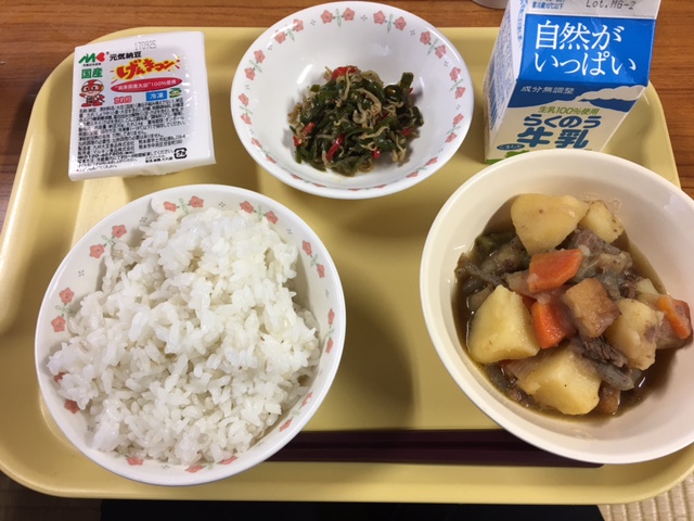 「麦ごはん 牛乳 肉じゃが 納豆 ピーマンのじゃこ炒め」でした。