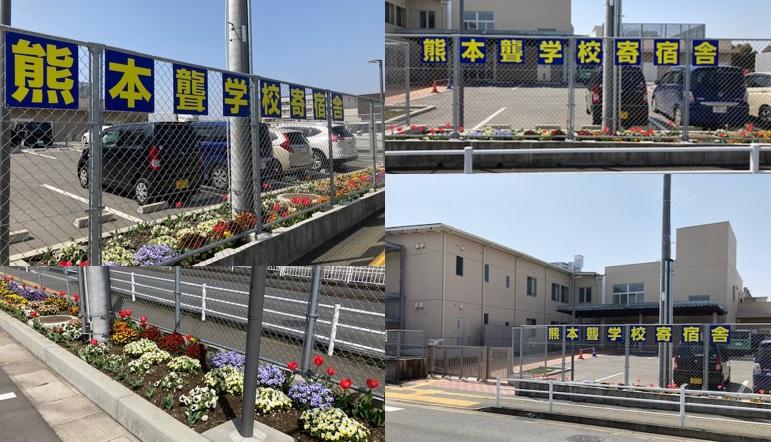 看板から少し目線を落としてみると、チューリップやパンジーなどが誇らしげに咲いています。どの花も例年よりも少し早めの春を迎えており、寄宿舎の花壇も今が見頃です。