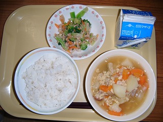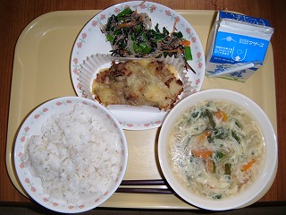 「牛乳、にらたまスープ、じゃがいものみそチーズ焼き、Caたっぷり和風サラダ」
