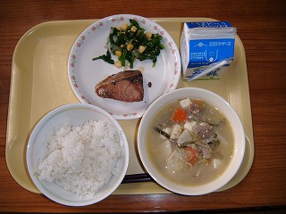 「牛乳、麦ごはん、豚汁、ぶりの照り焼き、ほうれん草サラダ」
