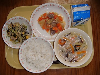 「牛乳、麦ごはん、ちゃんこ鍋、えびと大豆の甘がらめ、りんごケーキ」