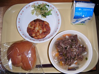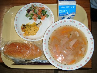 「牛乳、ミルクパン、オニオンスープ、魚のキャロット焼き、ビーンズサラダ」