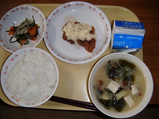 「牛乳、麦ごはん、なめこみそ汁、チキン南蛮、かぶの昆布和え」