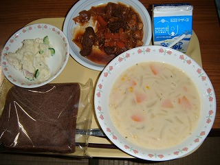 「牛乳、ココアパン、コーンスープ、レバーのケチャップ炒め、ポテトサラダ」