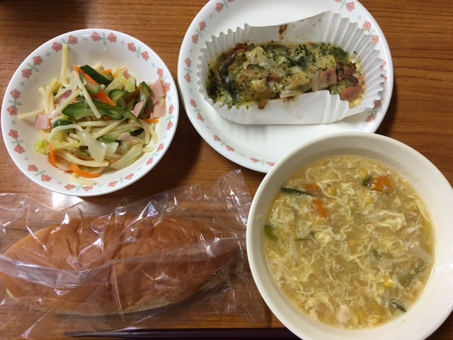「パインパン 牛乳 ひじきスパゲッティ サラたサラダ れんこん&ごぼうチップス」でした。
