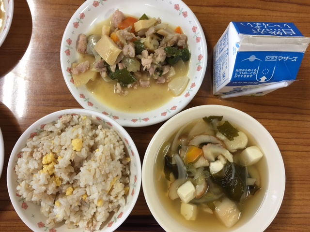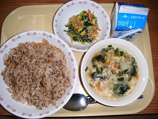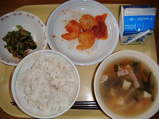 「牛乳、麦ごはん、にらと豆腐のスープ、えびのチリソース、わかめの酢の物」