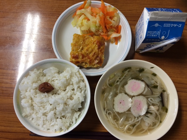 「セルフおにぎり(梅) 牛乳 そうめん汁 千草やき そえやさい」