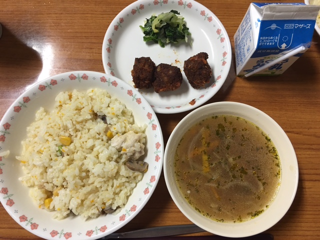 「コーンピラフ 牛乳 手作り肉団子のケチャップあえ やさいソテー オニオンスープ」