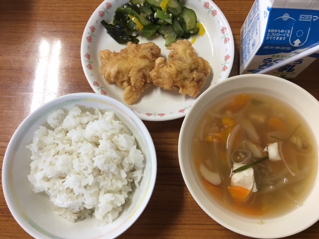 「麦ごはん 牛乳 すいもの とり天 わかめとおくらの和え物」