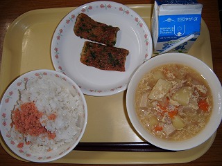 「牛乳、麦ごはん、鮭ふりかけ、ちくわの磯部揚げ、親子煮」