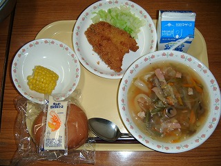 「牛乳、セルフフィッシュバーガー、コンソメスープ、ボイル野菜、とうもろこし」