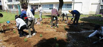 これまでは地肌がむき出しになっていたところですが、4月16日に、小学部の先生方と事務室の技師の先生方で「ラベンダー」や「ローズマリー」、「クチナシ」等の苗を合わせて約70株植えました。ある先生は「○○さん、△△さんたちが喜ぶだろうなぁ」なんてつぶやきながら、子供たちの喜ぶ顔を想像しながら植えておられました。他にも「ユキヤナギ」と「ヒュウガミズキ」を別の場所に植えてあります。(どこに植えてあるかは秘密です。今度学校に来た時に探してみてください。)