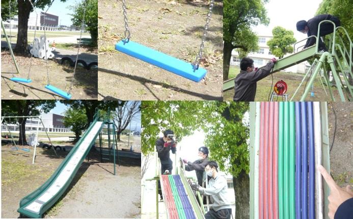 そんな子供たちの光景を見ることができない代わりに、天気が良い時にしか出来ないことを先生たちが率先してやってくれています。先ずは中庭のブランコやすべり台の安全確認とリニューアルを兼ねて、高等部の住吉先生と小学部の深草先生、平井先生が手入れをしてくれました。錆(さび)落としからペンキ塗りまで、丸一日かかったようです。