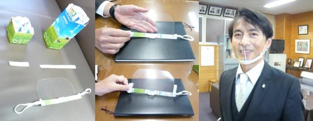 さて、透明マスクについては、既製品を購入はしてみましたが、大きさ等課題もまだまだあるようです。先生たちの中には自作透明マスクの試作品を幾つも作っておられる先生もいます。今日は千場教頭先生が牛乳パックとパウチフィルムとステイプラー(ホッチキスと言ったほうが分かりやすいですか?!)と不要になった不織布マスクのゴムを使って、透明マスクを作ってこられました。製作時間は2分です。