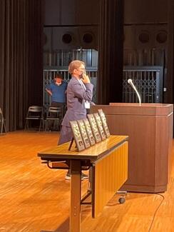 令和4年10月11日(火)に八代市鏡文化センターで熊本県高等学校弁論大会が行われました。毎年行われる高文連のこの大会に、今年は1年生と2年生、2人の生徒が参加しました。弁論大会は、論旨60点、表現40点の採点なのですが、審査委員長から表現については音声を除く「表情と意欲を評価しました。」と視覚的に伝わる熱意を評価していただきました。制限時間の調整など、準備不足の面もありましたが、「こんな発表の仕方(手話スピーチ)もあるんですね」と他校の引率の先生がおっしゃったように、自分の意見や考えをきちんと訴え、社会に啓発、貢献していくという熊ろうの生徒の前向きな姿勢は充分に伝わったと思います。