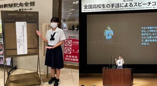 「第39回全国高校生の手話によるスピーチコンテスト」が9月10日(土)に東京の有楽町朝日ホールで行われました。36回大会以来、録画映像による審査が続いていましたが、今年は、久しぶりに、予選を勝ち抜いた10人による大会でした。本校生徒は、「聾者として社会の一員として~わたしのアイデンティティー~」というタイトルで、熊本地震時の共助、コロナ禍の今のコミュニケーションなど、経験を通して社会にどう働きかけていきたいか話しました。