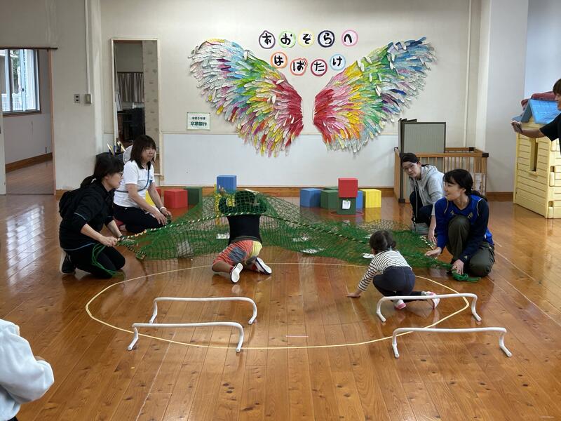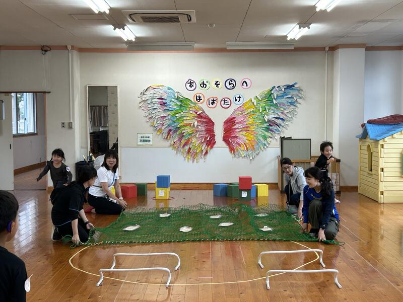 お絵かきやブロック遊びをしているときに、年長さんが年下のお友達を誘って一緒に遊んだり、給食の時間に年長さんが頑張って全部食べている様子を「すごいね」と年少さんが見ていたりするなど、それぞれのチームで学年を超えた関わりができました。