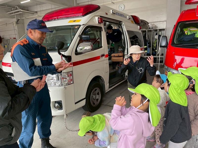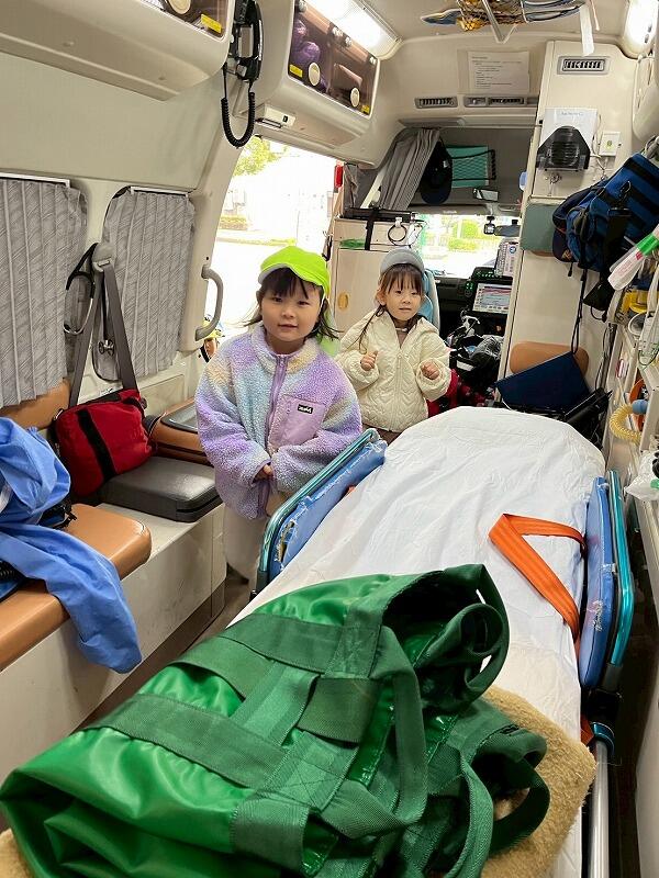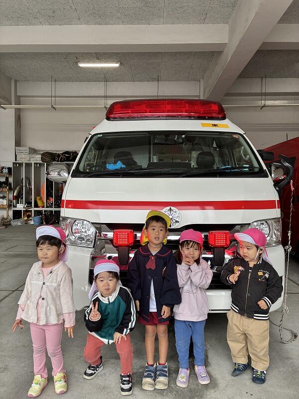 まず、赤組(3歳児)グループと青・緑組(4・5歳児)グループに分かれて見学をしました。消防車や救急車の中の様子を見たり、実際に使用している道具に触れたりしました。子供たちは、詳しく説明してくれる消防士さんのお話を一生懸命に見て(きいて)いました。