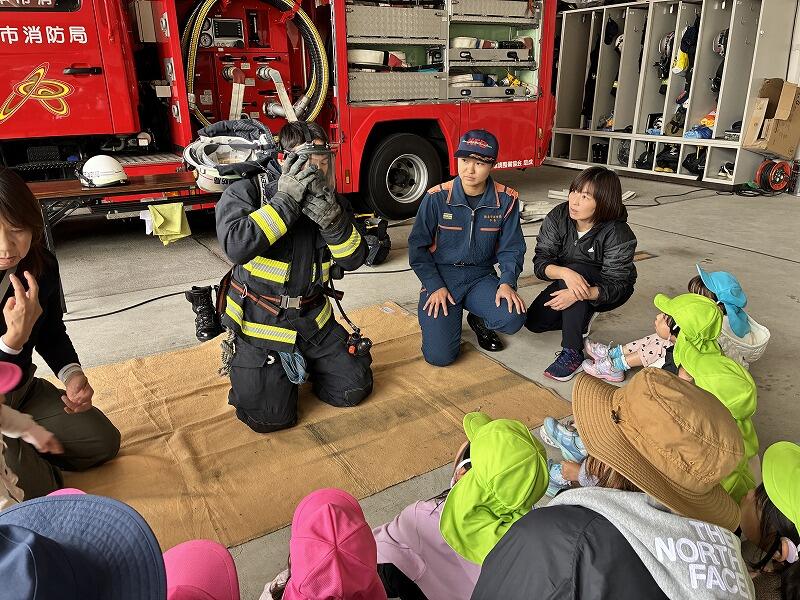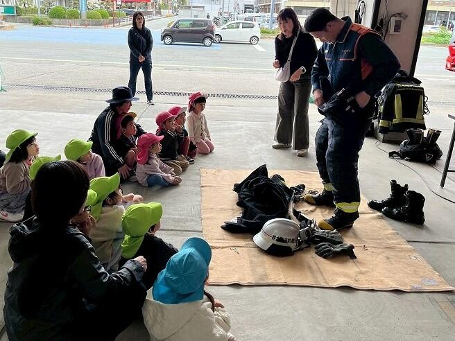 見学後、子供たちの中には、「大きくなったら、消防士になりたい」「消防士さんみたいに早く着替えるよ」などの感想がありました。