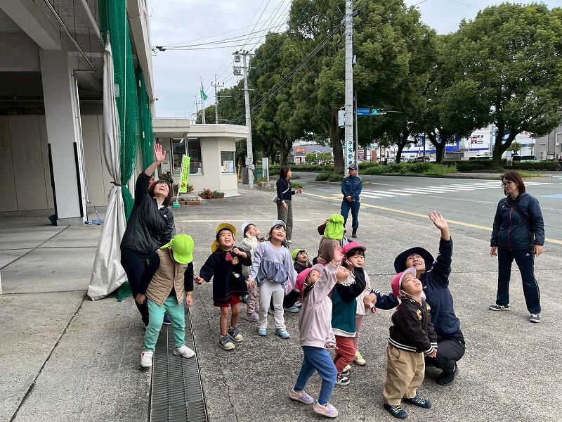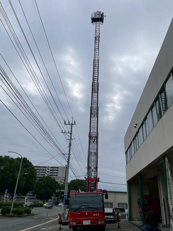 最後に、職員がはしご車に乗る体験をしました。35メートルの高さまではしごが伸びると、子供たちはその高さに驚き、地上から心配そうに見上げていました。