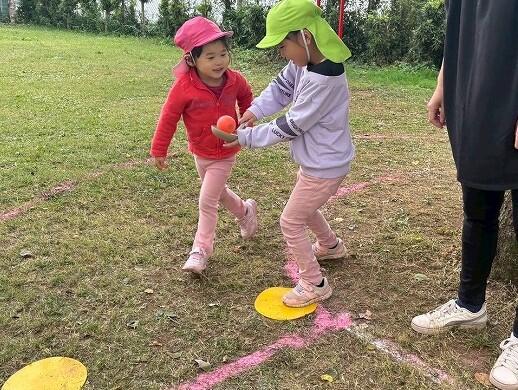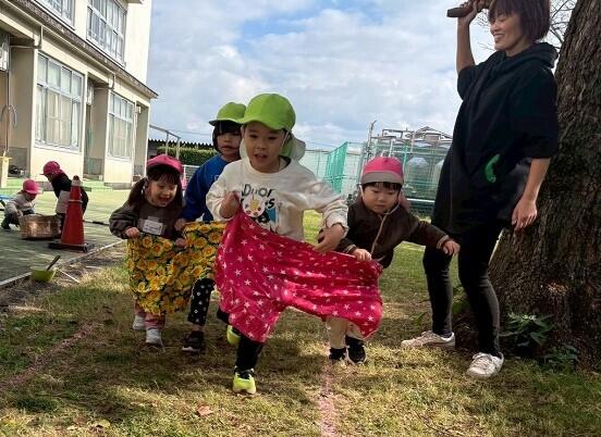 「くだものじゅーすチーム」は、1日目は、3歳児と4、5歳児がペアを作り、タオルを使ってボールを運んだり、籠にボールを入れたりして遊びました。2日目は、散歩をしました。落ち葉で遊んだことが楽しかったようです。3日目は、チーム対抗リレーに向けて話し合い、作戦を立てました。