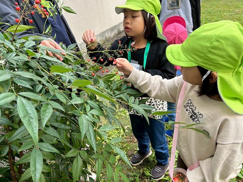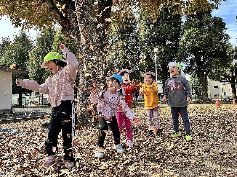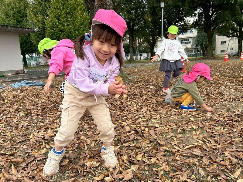 「ひこうきチーム」は、3歳児と5歳児が手を繋ぎ、1日目は聾学校の校庭、2日目は盲学校方面、3日目は熊本はばたき高等支援学校方面を散歩しました。紅葉した葉っぱや木の実を探したり、散歩途中で出会った他の学校の生徒さんや先生方とお話をしたりしました。