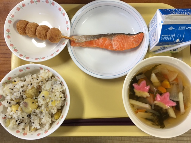 H28年9月15日 今日の給食 投稿日時 : 2016/09/15 寄・厨 今日の給食は「栗いもごはん 牛乳 もみじの麩のすいもの 鮭の塩やき きなこ団子」でした!今日は中秋の名月にちなみ、お月見献立でした!もち米入りなので、もちもちした食感でしたね。 Tweet {{options.likeCount}} {{options.likeCount}} 0 コメント